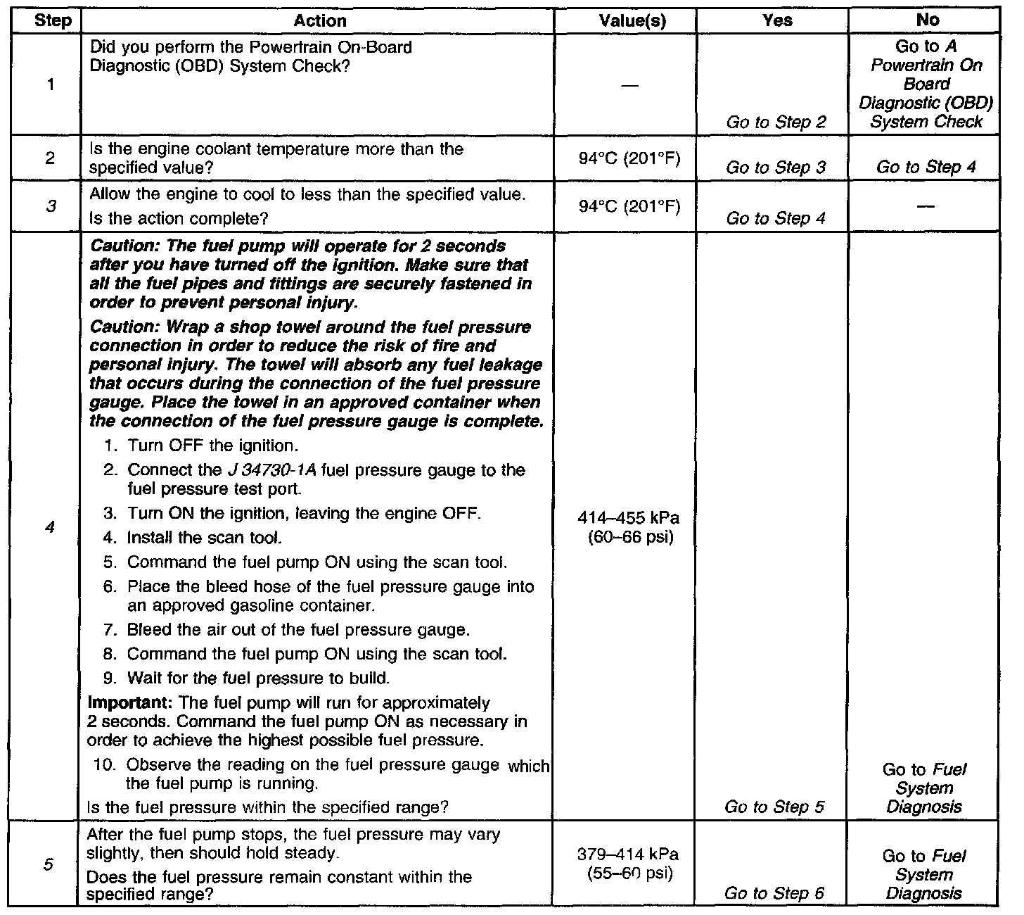 4. The fuel pressure should be within the specified range with the fuel pump running. If the fuel pressure is not within the specified range, go to Fuel System Diagnosis. Component Tests and General Diagnostics