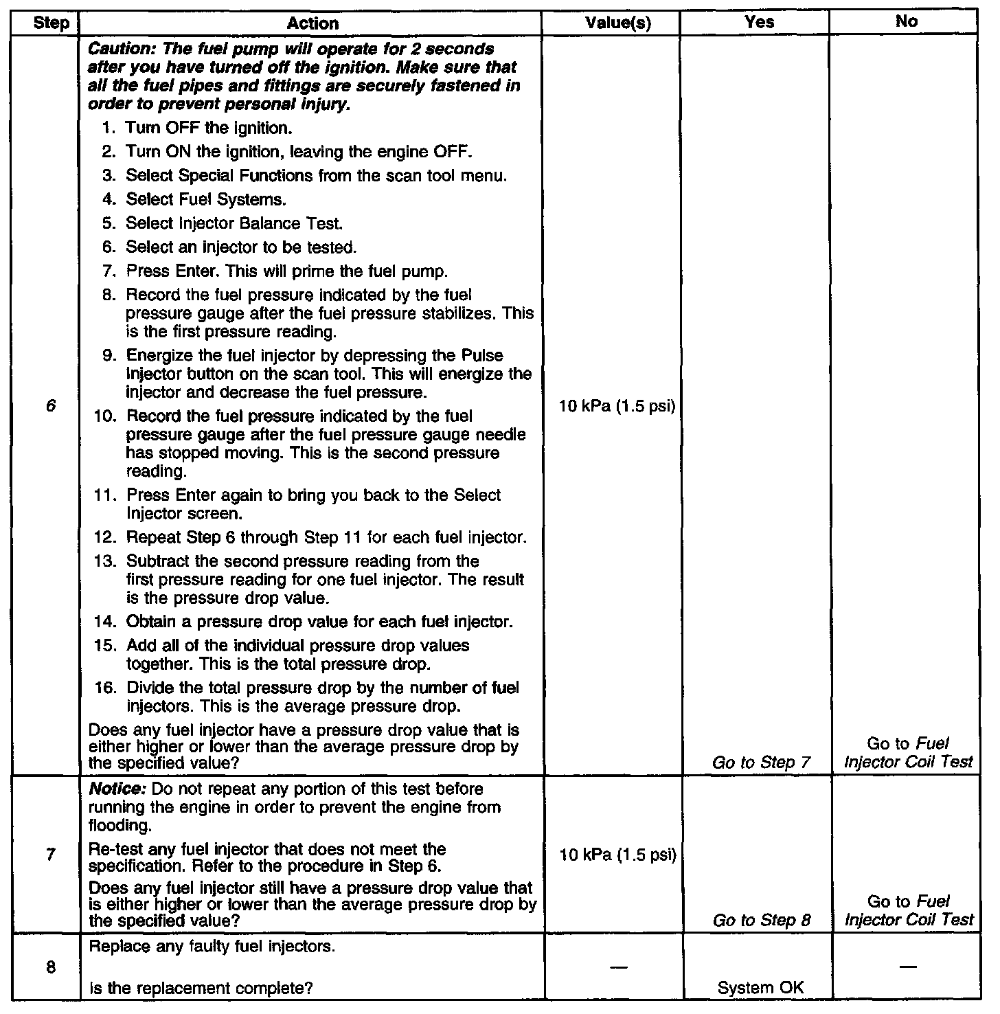 6. If the pressure drop value for each fuel injector is within 10 kPa (1.5 psi) of the average pressure drop value, the fuel injectors are flowing properly. Calculate the pressure drop value for each fuel injector by subtracting the second pressure reading from the first pressure reading.