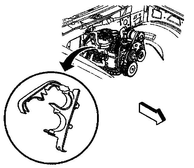9. Open the heater inlet and outlet hose retaining clip above the right side valve cover. Use a flat bladed tool to open the clip from the bottom.