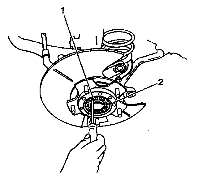 ^ Install the front wheel bearing seal lock washer retainer (2). Verify that the screw holes align.