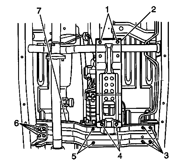 3. Install the transfer case crossmember (1) to the undercarriage.