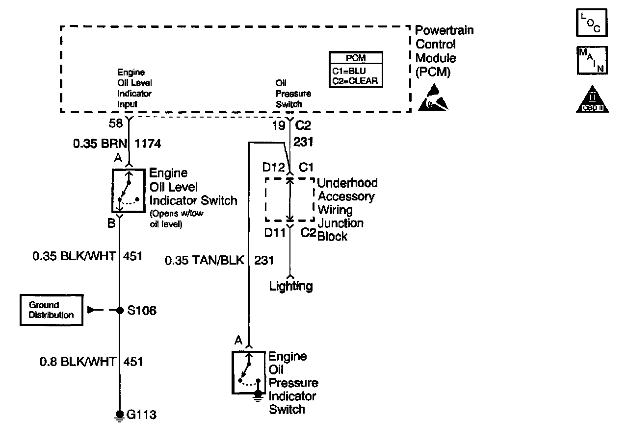The low oil level lamp will be illuminated for about a minute when the PCM tests for low oil level and the EOL switch indicates that a low oil level condition exists (EOL switch circuit not grounded). When the ignition is first turned ON, the IP Cluster commands the low oil level lamp ON for a brief period of time to test the bulb.