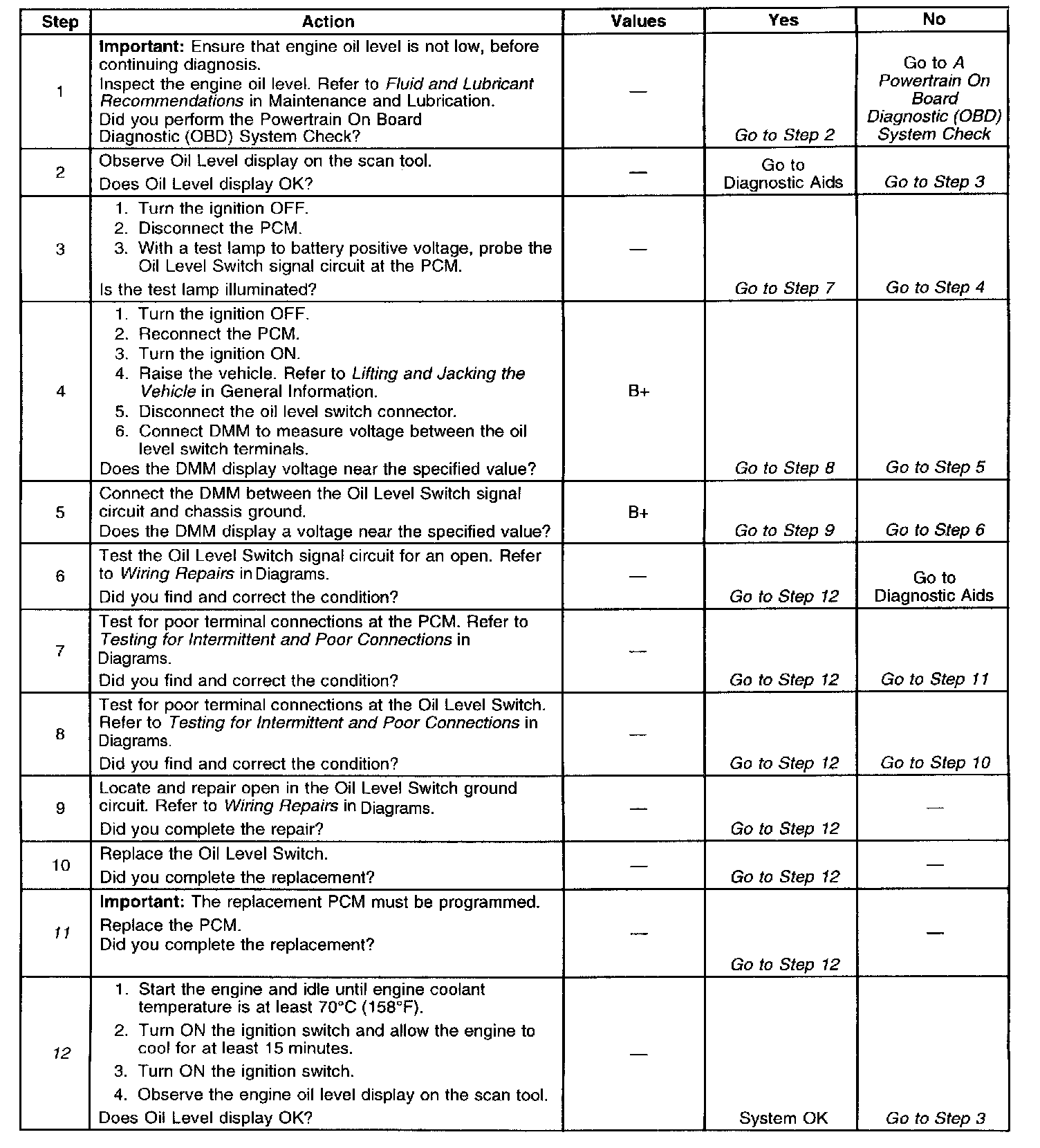 12. For the PCM to test engine oil level, start-up ECT must be at least 12°C (22°F) cooler than the ECT was last time the ignition was turned off. Allowing the engine to warm and then cool ensures that the PCM tests the engine oil level switch and that the information displayed on the scan tool is current.
