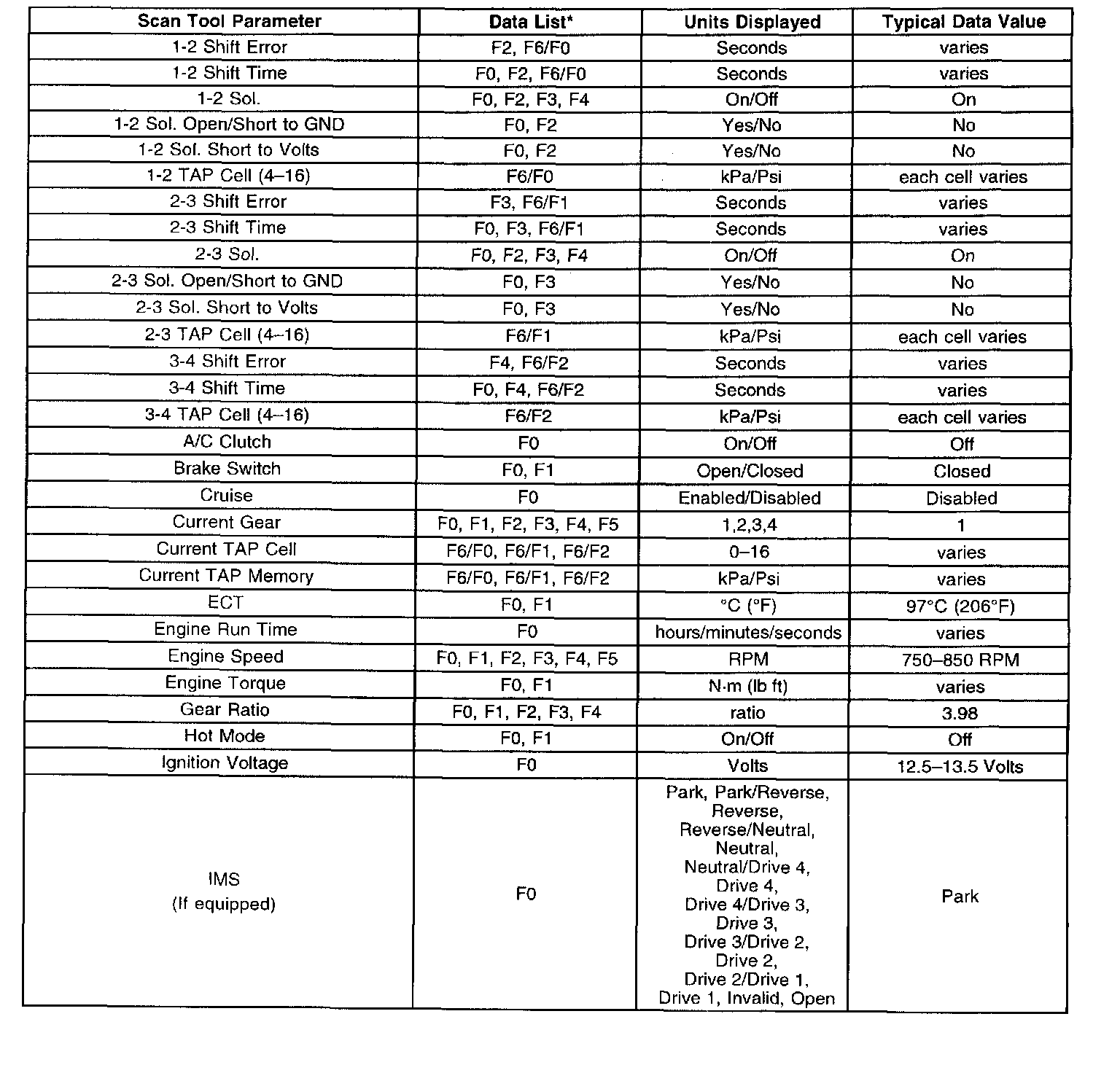 Only the parameters listed are used for diagnosing. If a scan tool displays other parameters, the values are not recommended by General Motors for use in diagnosis. Scan tool values below were recorded under the following conditions: