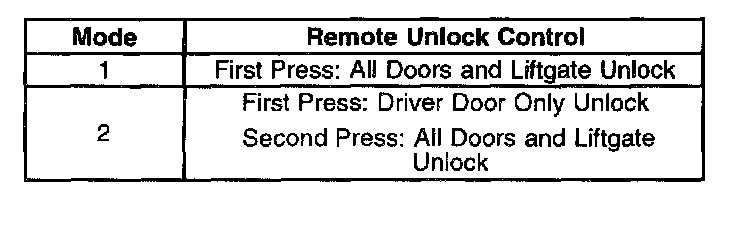 The seat belt telltale will flash and the chime will sound 1-2 times in order to indicate which remote unlock control mode the BCM is in.Each time the transmitter UNLOCK button is pressed, the mode number will advance. A transition past mode 2 will repeat and start again at model.