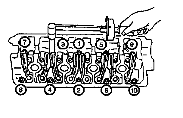 Tighten the cylinder head bolts (1) in 3 separate steps, following the illustrated sequence.