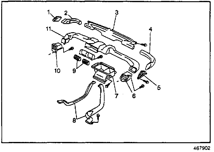 The outlets on each end of the dash (1 and 5) are called the side window air (defroster or demister) outlets. The other outlets (6 and 10) are called Air Outlets (Left Side Vent (10) and Right Side Vent (6)) and face the driver or passenger's outboard shoulder.