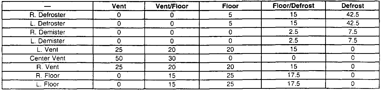 The table shown represents the design intent for the air distribution from the air outlets in each control setting and the percent of the air flow which should be distributed by the system to the outlets. By design, air should be flowing from the Air Outlet Vents (6 and 10) at all times, except for the Defrost mode.