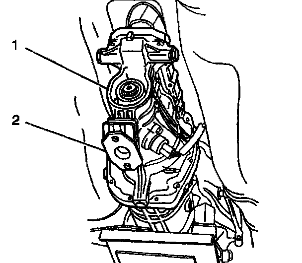 6. Remove 1 bolt and the rear transmission mount (2) from the extension case (1).