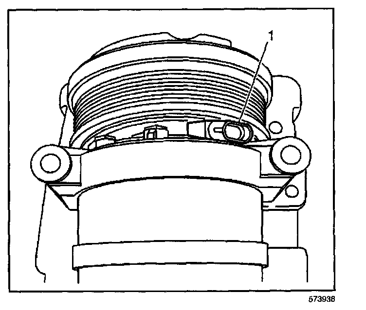 4. Disconnect the electrical connector (1) from the A/C clutch.