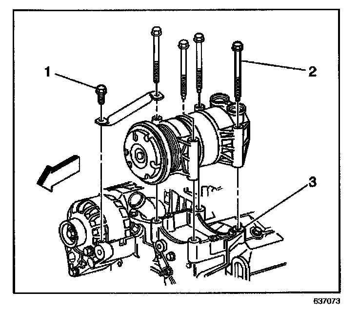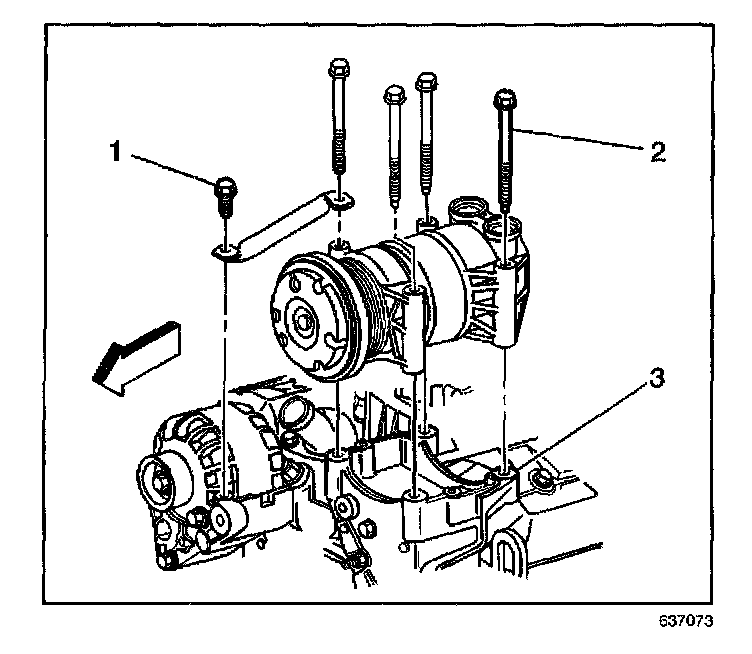 9. Remove the compressor hose assembly bolt (3) from the compressor.