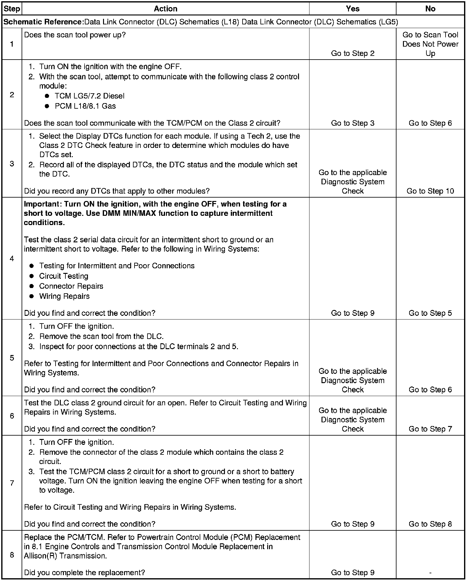 2. The powertrain control module (PCM) communicates on the class 2 serial data circuit with the L18/8.1 engine. The transmission control module (TCM) communicates of the class 2 serial data circuit with the LG5/7.2 engine.