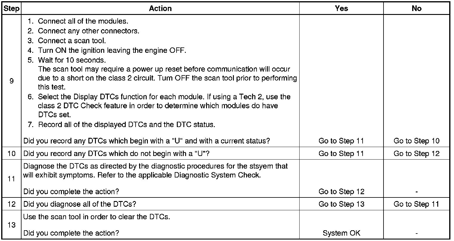 Modules connected to the class 2 serial data circuit monitor for serial data communications during normal vehicle operation. Operating information and commands are exchanged among the modules. Connecting a scan tool to the DLC allows communication with the modules for diagnostic purposes. DTCs may be set due to this symptom and during this diagnostic procedure. Complete the diagnostic procedure in order to ensure all the DTCs are diagnosed and cleared from memory.