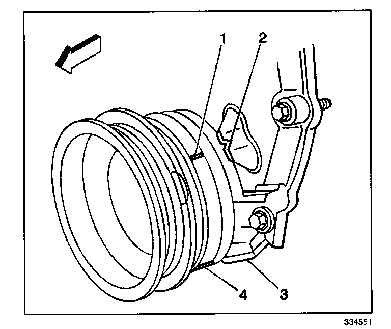 IMPORTANT: Rotate the number 1 cylinder to top dead center (TDC) of the compression stroke. The engine front cover has 2 alignment tabs and the crankshaft balancer has 2 alignment marks spaced 90 degrees apart which are used for positioning the number 1 piston at TDC. With the piston on the compression stroke and at TDC, the crankshaft balancer alignment mark (1) must align with the engine front cover tab (2) and the crankshaft balancer alignment mark (4) must align with the engine front cover tab (3).
