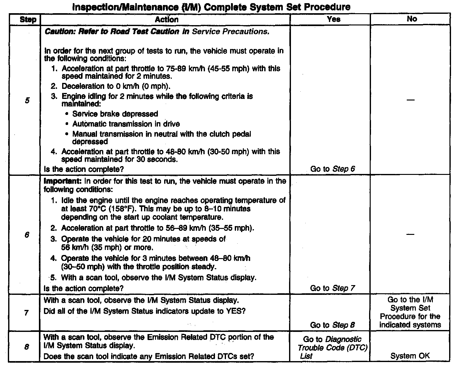DESCRIPTIONThe purpose of the I/M Complete System Set Procedure is to satisfy the enable criteria necessary to execute all of the I/M readiness diagnostics, and complete the trips for those particular diagnostics. When all diagnostic tests are completed, the I/M System Status indicators are set to YES. Perform this test when more than one or all of the I/M System Status indicators are set to NO.
