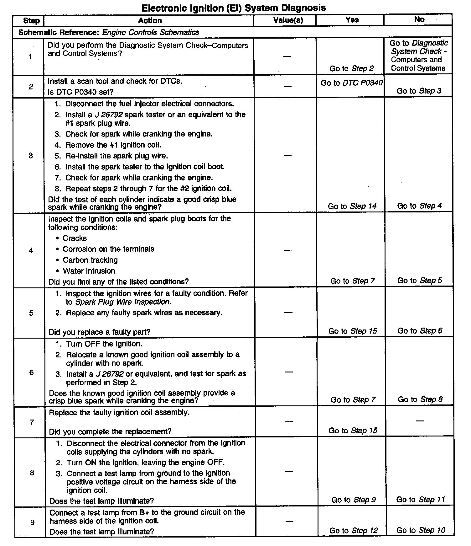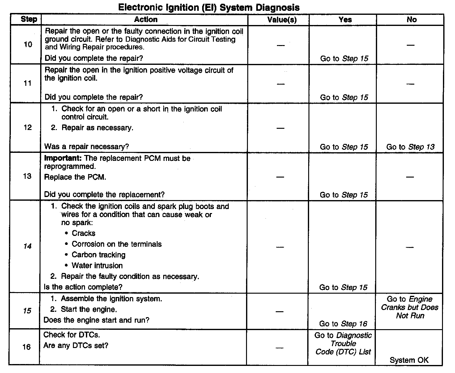 15. This step checks whether the engine will start and run. A repair that has been performed leading to this step may only have been a contributing cause of a no start condition. Returning to the Engine Cranks But Does Not Start diagnostic table will locate additional causes of the no start condition.