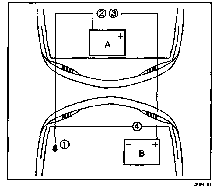 12. Disconnect the red positive (+) cable from the positive (+) terminal (4) of the vehicle with the discharged battery.
