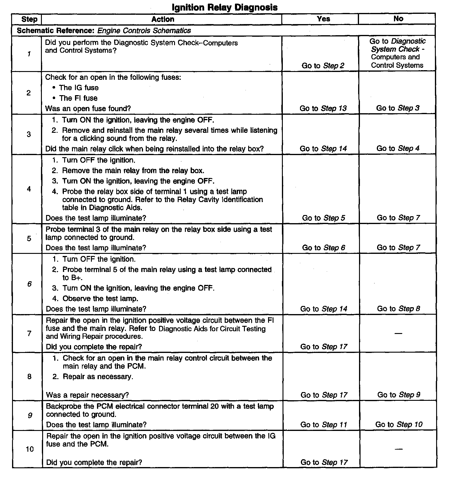 9. This step checks for ignition positive voltage at the PCM. The PCM will not operate the main relay if there is no power to terminal 20.