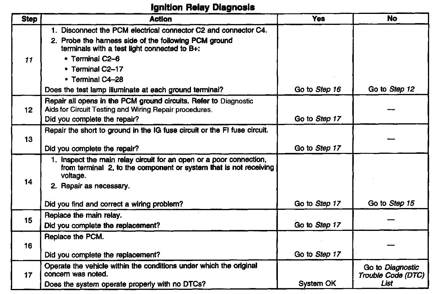 11. This step checks for an open in the PCM electrical grounds. The PCM will not operate the main relay if there are no electrical grounds.