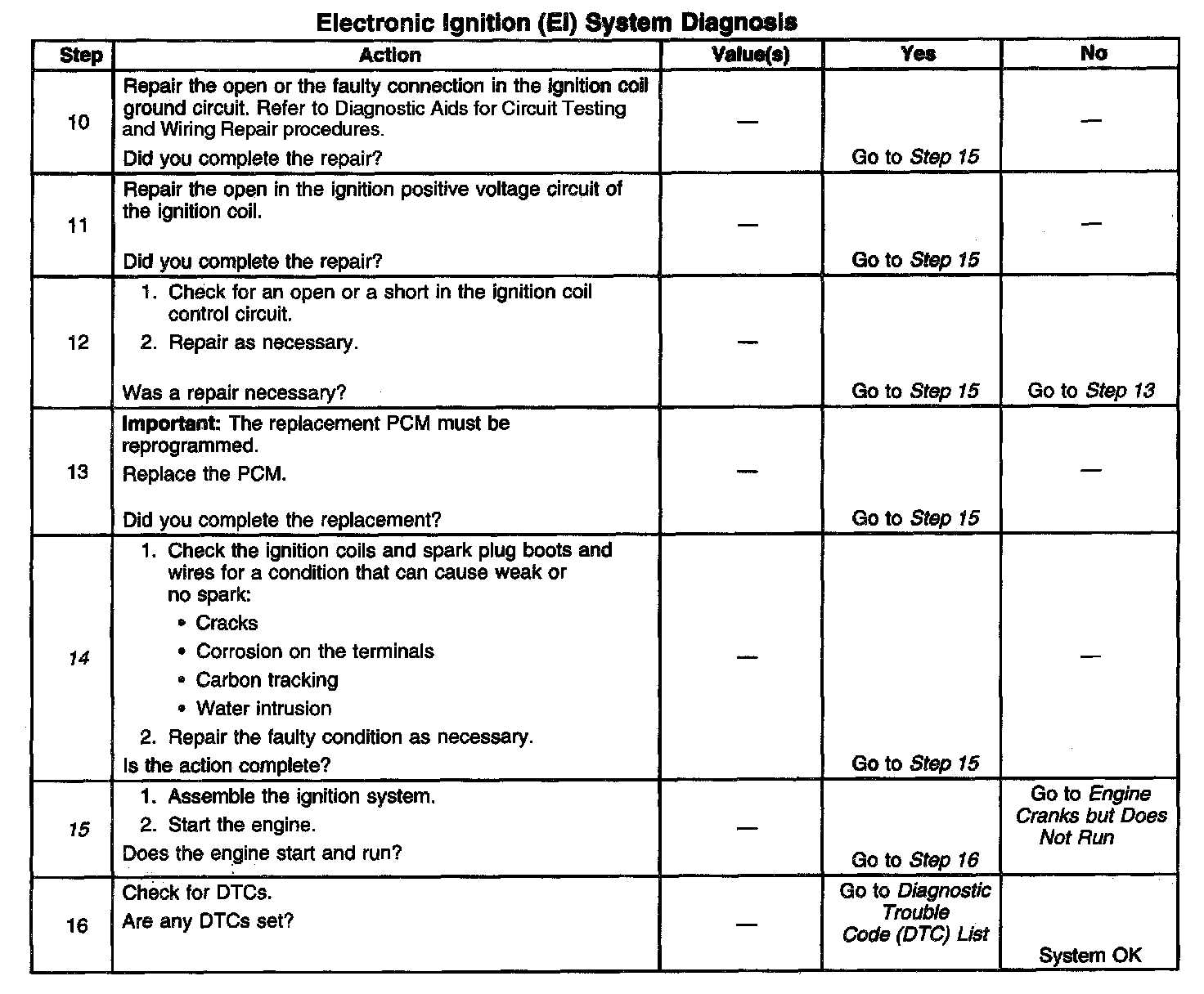 15. This step checks whether the engine will start and run. A repair that has been performed leading to this step may only have been a contributing cause of a no start condition. Returning to the Engine Cranks But Does Not Start diagnostic table will locate additional causes of the no start condition.
