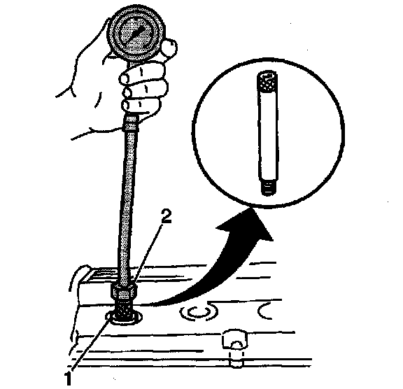 6. Install a compression gage (2) into a spark plug hole.