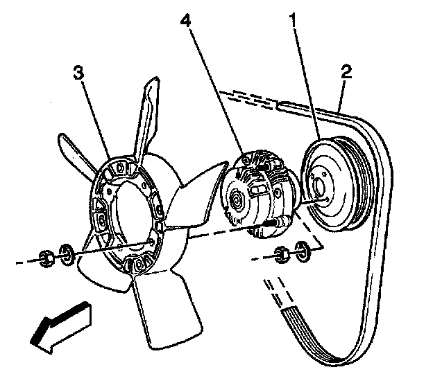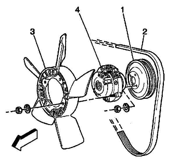 20. Install the cooling fan and generator drive belt (2).
