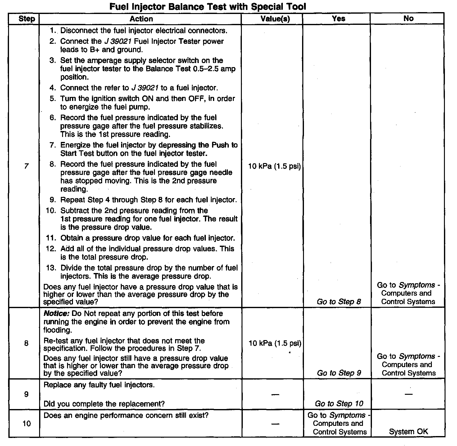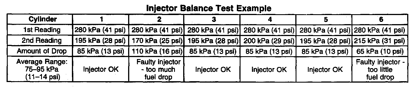 7. The fuel injectors are flowing properly if the pressure drop value for each fuel injector is within 10 kPa (1.5 psi) of the average pressure drop value. Calculate the pressure drop value for each fuel injector by subtracting the second pressure reading from the first pressure reading. Refer to the examples in the table.