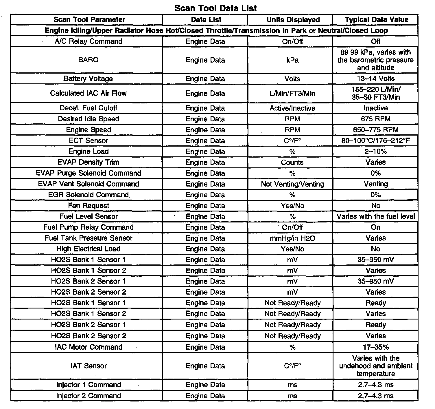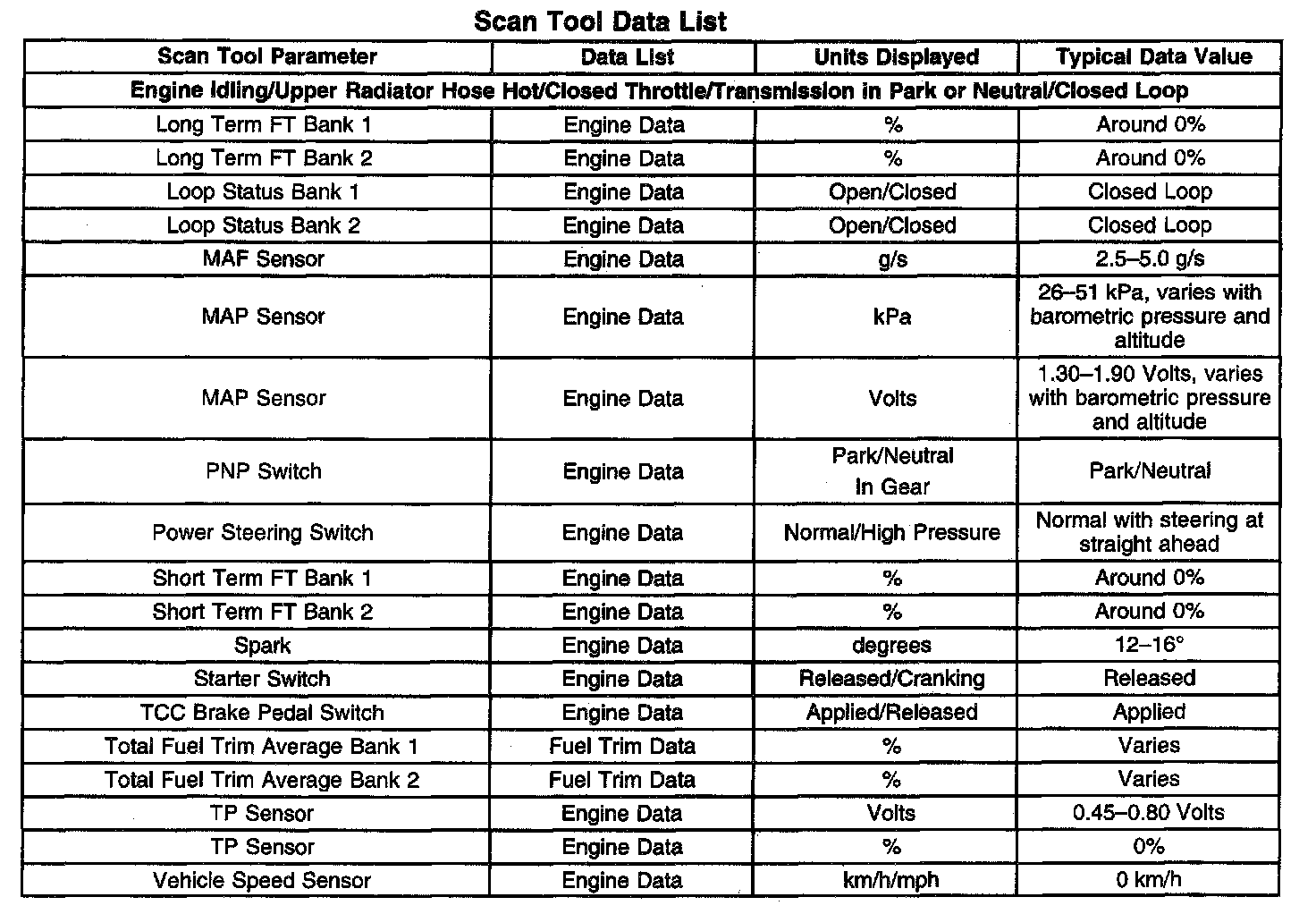 The scan tool values from a correctly operating engine may be used for comparison with the engine you are diagnosing. The values listed in the following table represent typical values that would be seen on a good running engine.