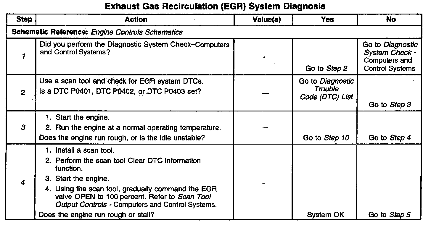 10. This step determines whether an electrical fault is the cause of the EGR valve staying open. An EGR valve control circuit that becomes shorted or open when the EGR valve is open, can cause the valve to remain open all the time.