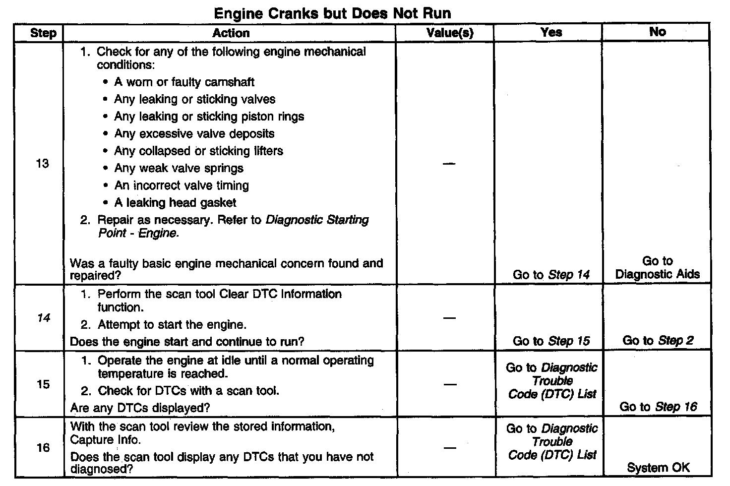 14. This step checks to see if the engine will start and run. The repair that may have led to this step may only have been a secondary cause of the no start condition, such as fouled spark plugs. The diagnostics in this table may need to be performed a second time in order to discover the root cause of the no start condition.
