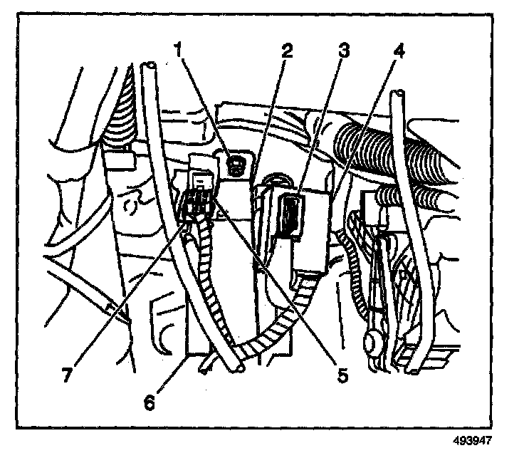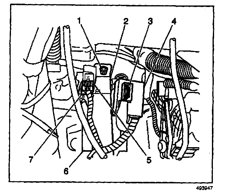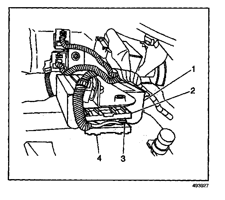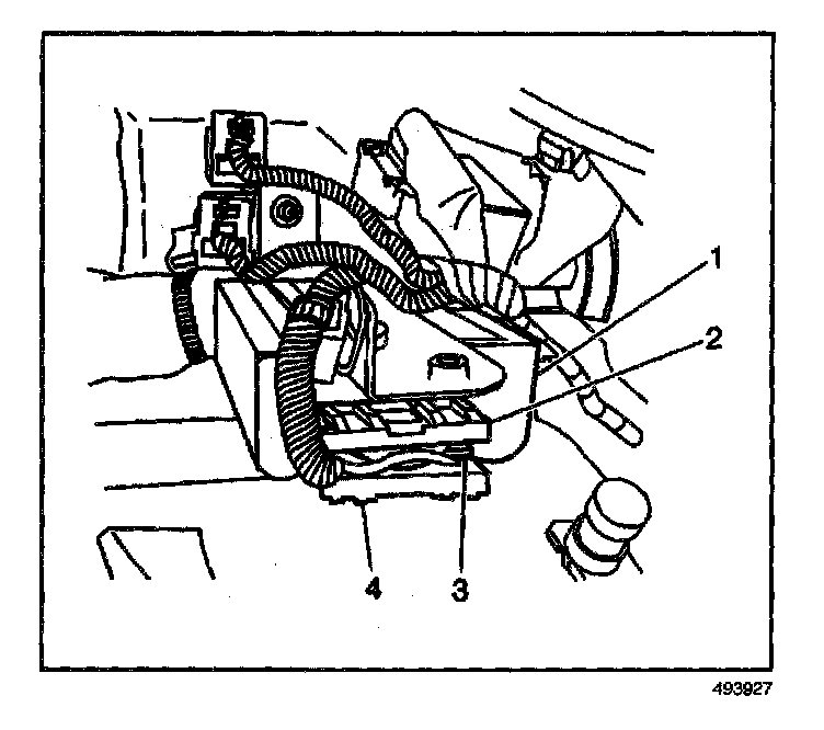3. Install the 2 retainers (2,4) which secure the remote control door lock receiver electrical connector (3).