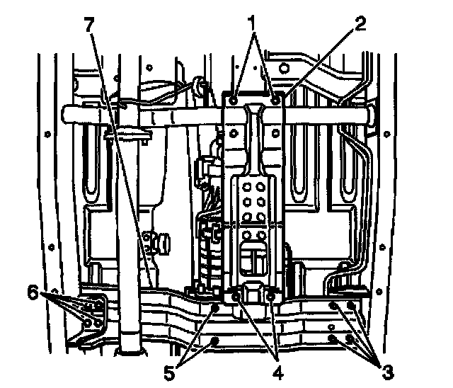 6. Install the transfer case crossmember (1) to the undercarriage. Secure the crossmember with the 6 bolts (3).