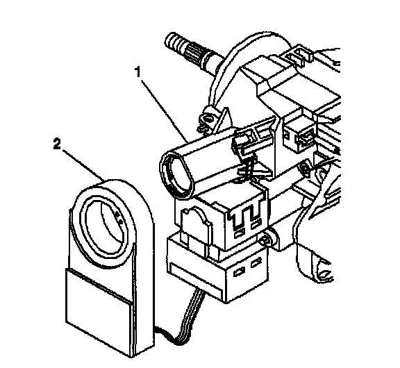 1. Install the theft deterrent control module (2) onto the ignition lock cylinder case assembly (1).