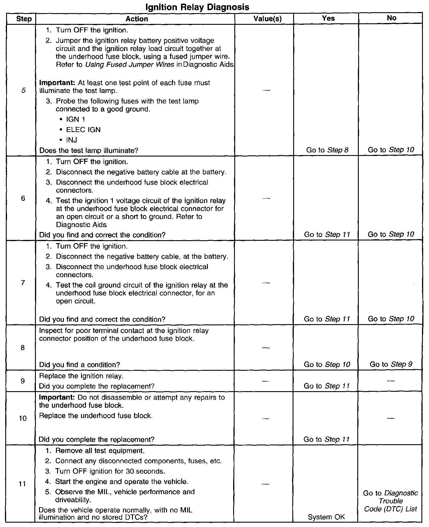 5. This step isolates the circuit from the ignition relay. All of the circuits at the relay are good if the test lamp illuminates.