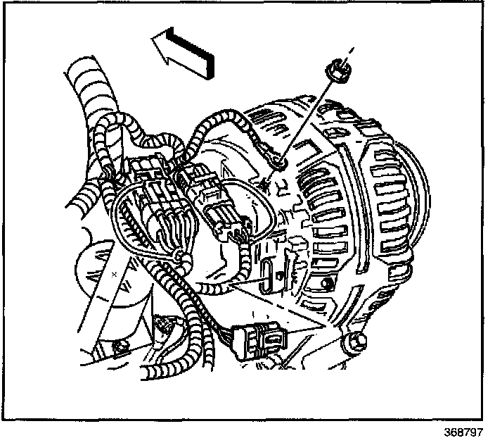 2. Rotate and secure the engine forward to access rear generator bolts. Refer to Rotating the Engine for Service Access in Engine-3.4L.