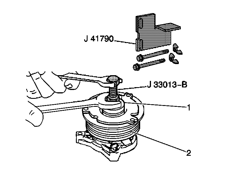 NOTE: Do not drive or pound on the clutch hub or shaft. Internal damage to the compressor may result. The forcing tip on the J 33013-B remover/installer center screw must be flat or the end of the shaft/axial plate assembly will be damaged.