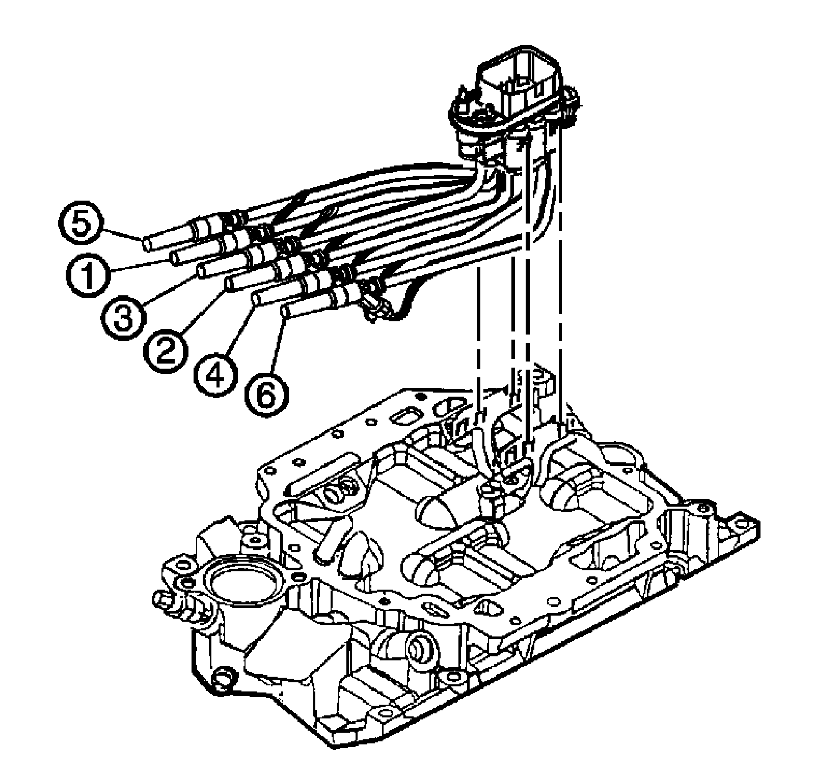 Install the 6 injectors into the proper lower intake manifold bores in proper sequence as shown in the image (3, 5, 1, 2, 4, 6)