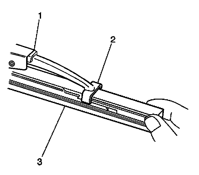 3. Engage the bottom claw (2) of the wiper blade (1) into the notches in wiper blade element (3).