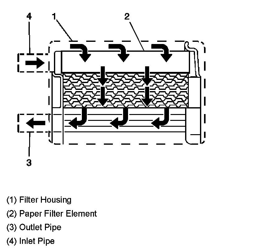 The fuel filter is located in the fuel feed pipe, between the fuel pump and the fuel injectors. The paper filter element (2) traps particles that may damage the fuel injection system. The filter housing (1) is made to withstand maximum fuel system pressure, exposure to fuel additives, and changes in temperature.