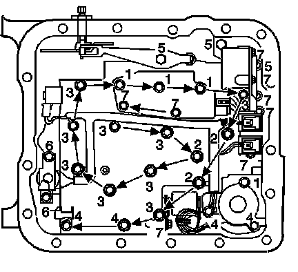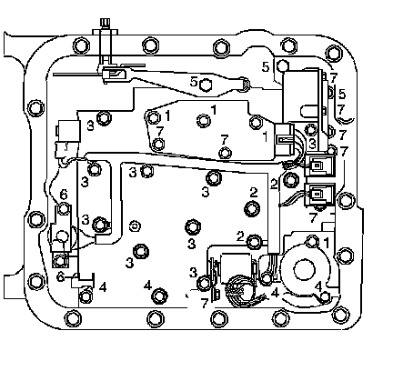 Do not install the transmission fluid indicator stop bracket and bolt at this time. Install but do not tighten the control valve body bolts which retain only the valve body directly. Each numbered bolt location corresponds to a specific bolt size and length, as indicated by the following: