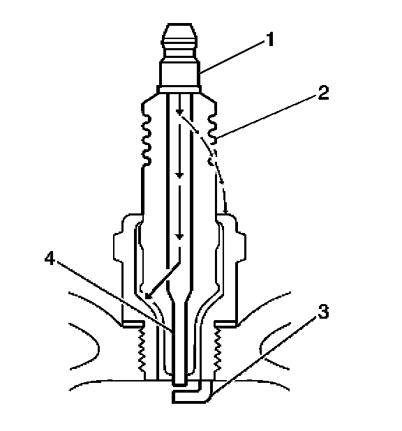 - Inspect the insulator (2) for cracks. All or part of the electrical charge may arc through the crack instead of the electrodes (3, 4).