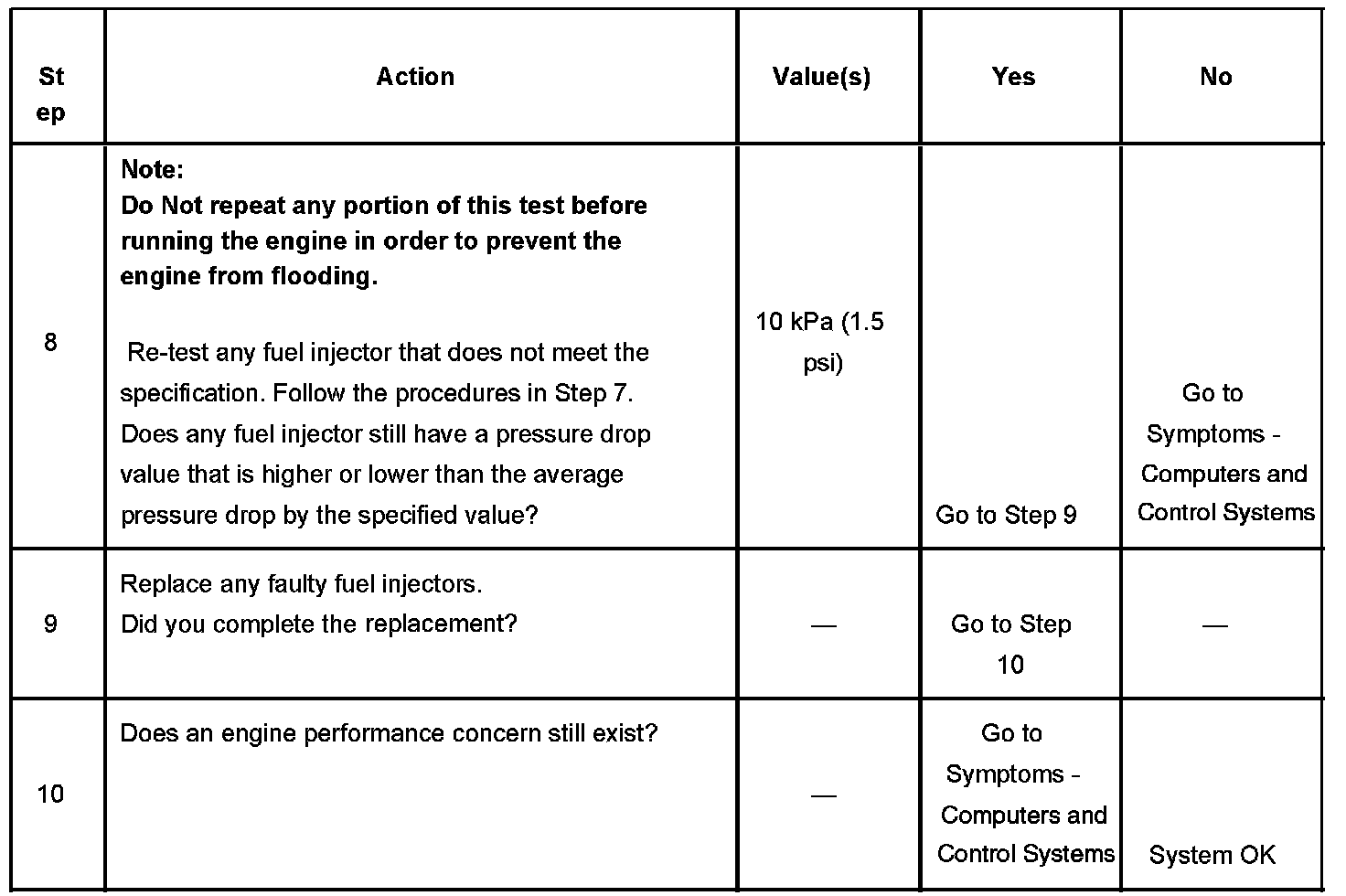 7. The fuel injectors are flowing properly if the pressure drop value for each fuel injector is within 10 kPa (1.5 psi) of the average pressure drop value. Calculate the pressure drop value for each fuel injector by subtracting the second pressure reading from the first pressure reading. Refer to the examples in the preceding table.