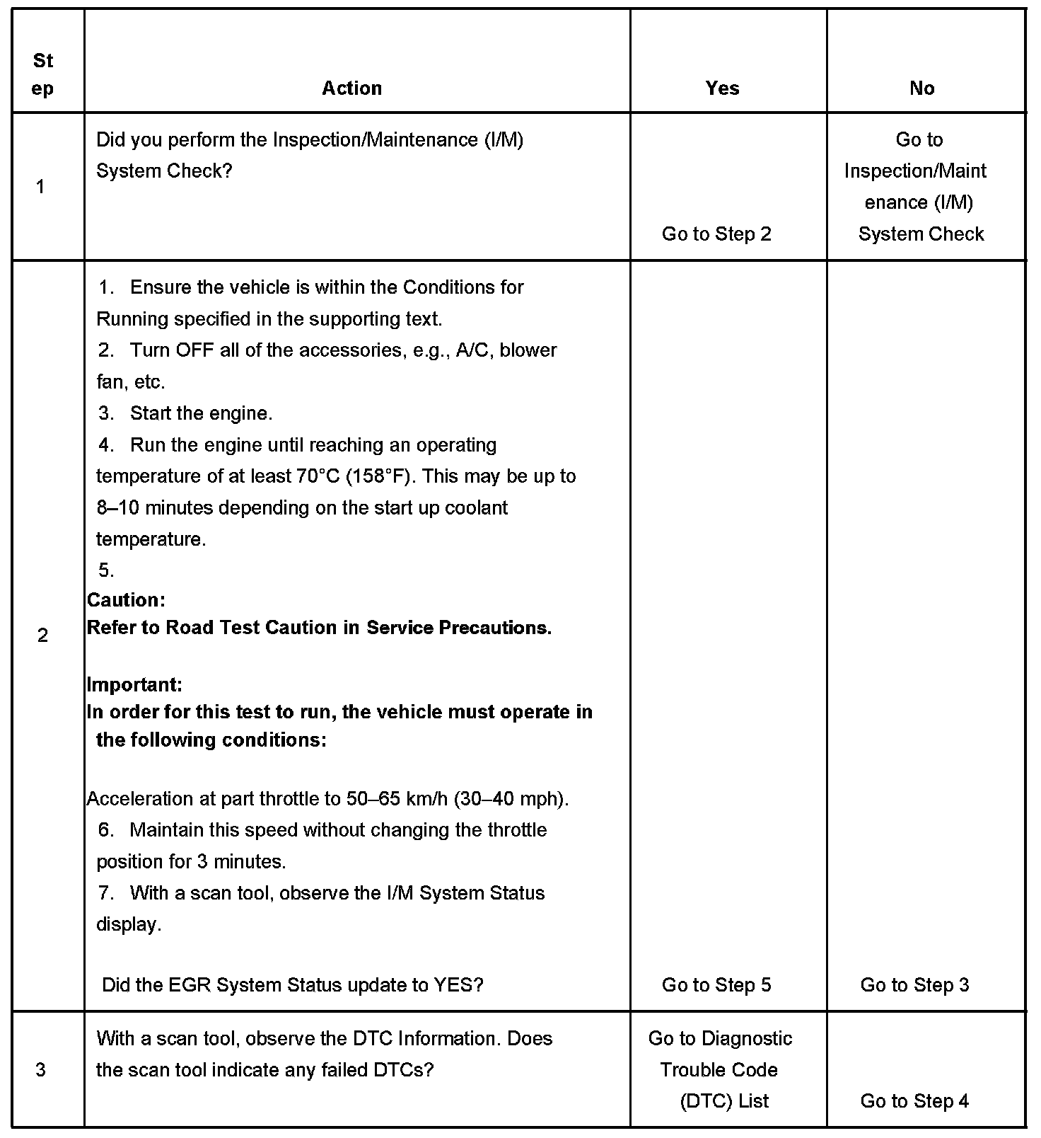 The purpose of this test is to satisfy the enable criteria necessary to execute I/M readiness diagnostics for the exhaust gar recirculation (EGR) system. The test may be used to set the I/M System Status indicators to YES. Ensure the vehicle meets the requirements listed in Conditions for Running before performing this test. Failure to meet the necessary requirements may produce inaccurate test results.