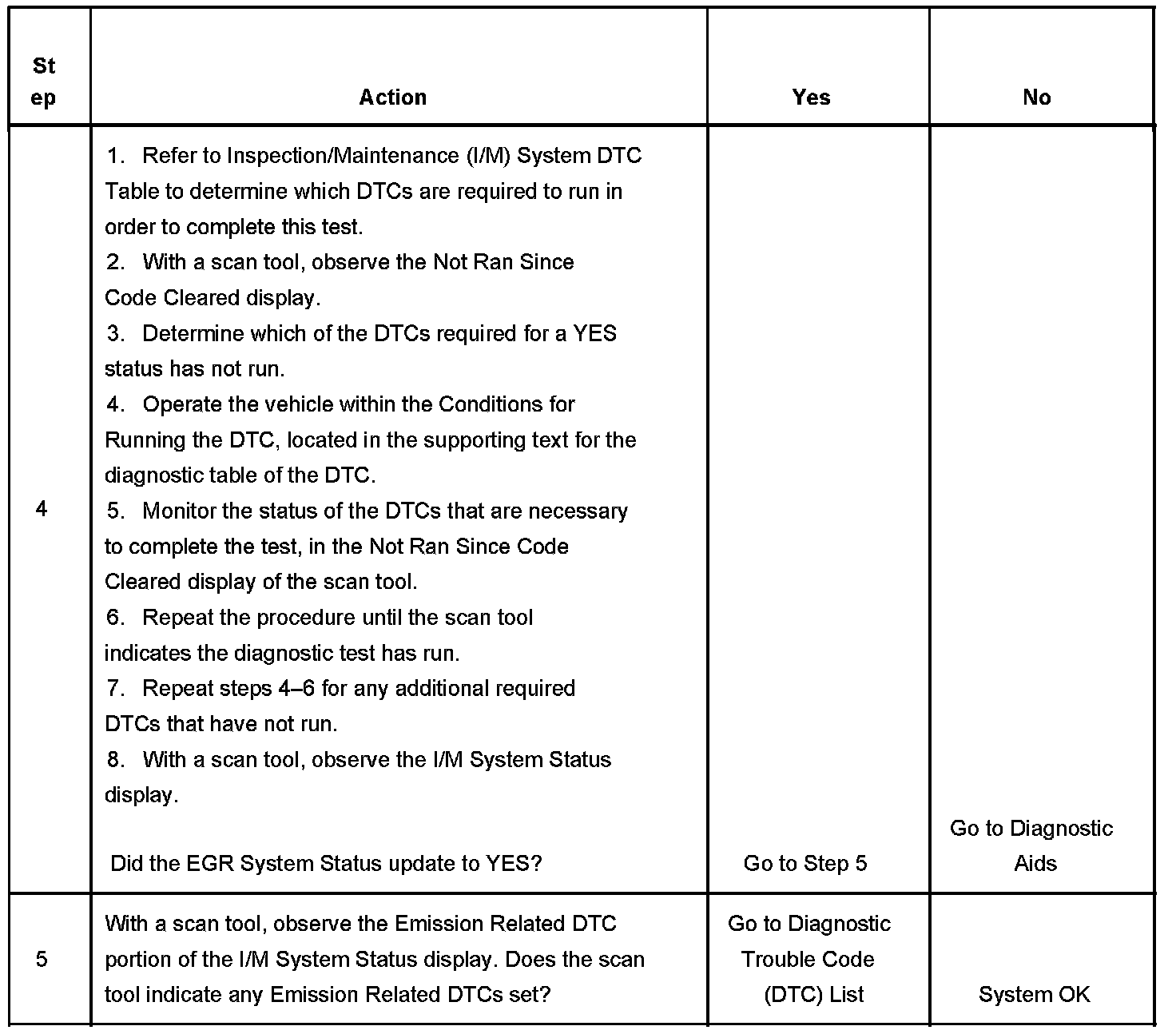 5. The I/M System Status only reports on whether or not a diagnostic has run, not what the outcome of the test was. If any Emission Related DTC sets after the tests are complete, the DTC will require diagnosis.