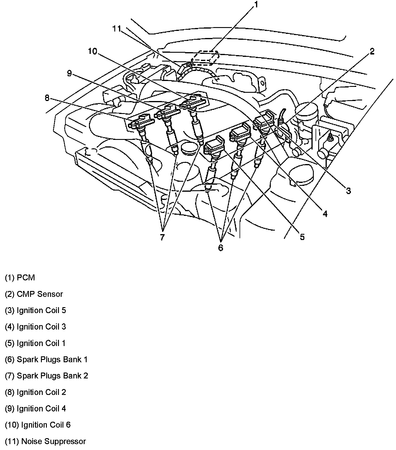 The PCM uses reference pulses from the camshaft position (CMP) sensor in order to determine engine speed. The PCM cannot operate the ignition system-or the fuel injectors-without the engine speed signal from the CMP. The six ignition coils supply spark to each engine cylinder, or spark plug, at precisely the right time. When the PCM sends a signal to the ignition module that is built into the ignition coil, the module responds by interrupting the current flow in the primary coil windings. Interrupting the current flow causes the electrical field around the primary coil to collapse, inducing a high voltage in the secondary coil. The secondary coil voltage travels unhindered to the spark plug, through the high voltage output terminal and boot assembly.