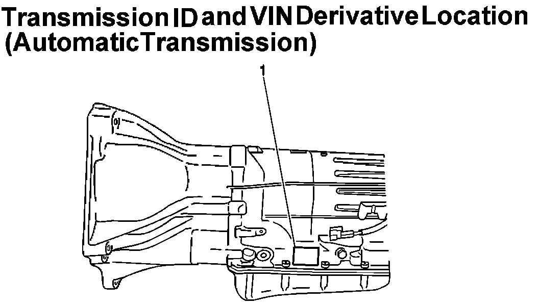 The automatic transmission model identification is located on a label or tag or stamped or etched on the transmission case (1). If this label is missing or unreadable, use the service parts identification label in order to identify the vehicle's transmission.