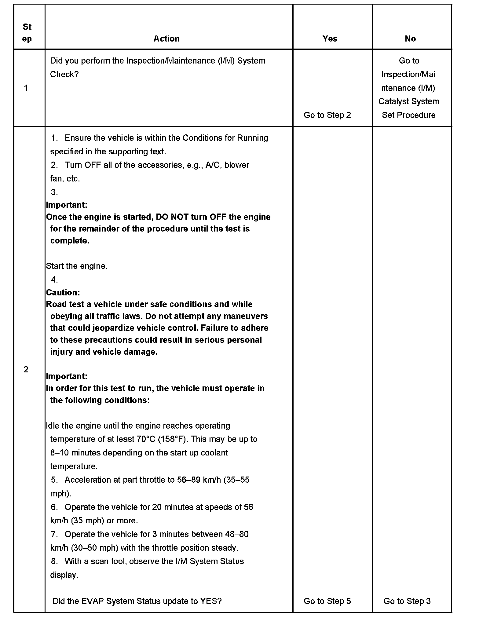 Extreme high or low ambient temperatures may prevent the EVAP System Tests from initiating. Performing a visual inspection prior to running the EVAP System Set Procedure may prevent having to repeat the test. A loose fuel cap may cause a test to abort or fail and prevent the I/M System Status from updating. A failed or aborted test will require the vehicle to cool down in order to meet the enable criteria to run another test.
