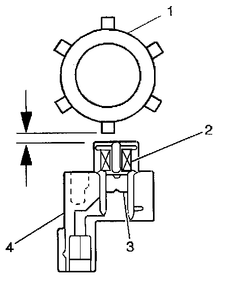 The CKP sensor (4) generates a magnetic field within the magnet (3) and coil (2) assembly. The CKP sensor has a specified air gap between the sensor core end and the crankshaft signal rotor (1) that is located on the crankshaft. An A/C voltage is generated in the sensor when crankshaft rotation causes a change in the magnetic flux. The CKP sensor sends the A/C voltage signal to the PCM.