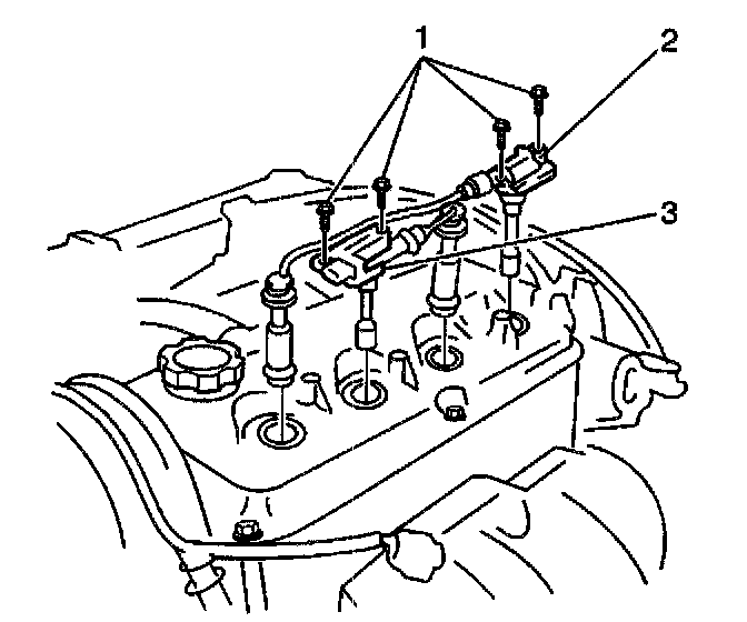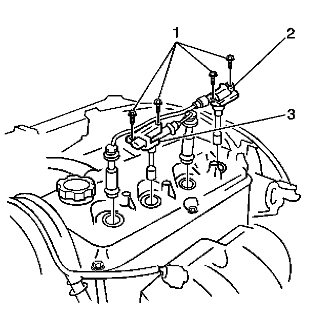 3. Remove the two bolts (1) that secure the ignition coil 1 (2) or the ignition coil 2 (3) to the valve cover.