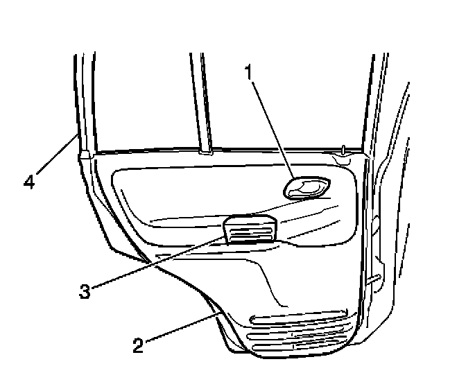 3. Gently pry the rear side door trim panel (2) from the rear side door by disengaging the plastic retainers which secure the panel.